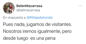 Álvaro Rey García (@AlvaroRey98): «El club majariego facilitará el desplazamiento a sus socios y se beneficiará de la taquilla». Pache (@Opcpache): Cierto, es el partido menos indicado para mostrar nuestro malestar. Desgraciadamente no tendría repercusión. Y además ya lo dije días atrás, nadie se merece más este partido que nosotros». Guille García (@guille_gih): «Todo esto se traduce en más entradas los domingos, más abonados la temporada que viene (o esta), más afición, más ambiente… más dinero. No suena mal, pero me parece que no era tan descabellado pensar un poco a futuro y no traicionar a tu afición por unos miles de euros hoy». Flaseados firm: «A todo esto, la RFEF ha sido la que da el visto bueno. Normal, lo primero que le importa también es el dinero, solo hay que ver dónde hacen las súper Copas de España».