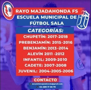 MANU RAMOS. «La escuela municipal de fútbol sala dispone de plazas para la temporada 2022-2023. Toda la información en el teléfono 689.170.679 y en el correo escuelafsmajadahonda@ gmail.com». Con este mensaje, el club de fútbol sala Rayo Majadahonda da a conocer la apertura de su escuela. Y desde este martes 20 de septiembre (2022) ya pueden vestir los colores y la camiseta del Rayo Majadahonda y disputar partidos los «chupetines» (nacidos en 2017-18), prebenjamines (2015-16), benjamines (2013-14), alevines (2011-12), infantiles (2009-10), cadetes (2007-08) y juveniles (2004-05-06) tanto masculinos como femeninos. Además, un año más, el club de Fútbol Sala Majadahonda, en colaboración con la “Fundación Rayo Majadahonda” desarrolla el “Proyecto un@+”, un proyecto que busca la integración completa en la sociedad, de chic@s con discapacidad intelectual, con el deporte como herramienta para conseguirlo. El proyecto también está abierto a chicos y chicas con discapacidad intelectual, de cualquier edad. Mas información en el tel: 689.17.06.79 y en el correo proyectounomas@rayomajadahonda.com.