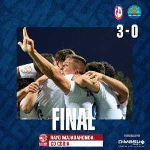 FICHA DEL ENCUENTRO. Rayo Majadahonda (4-2-3-1): Adrián Fernández (3), Emi (MVP, 3), Salama (3) (Villalón, 80′) (3), Dani Ramos (3), Expósito (3); Mosquera (3), Berzal (3); Rubi (3) (Ebea, 80′) (3), Fer Pina (3) (Pascual, 73′) (3), Kevin Manzano (MVP, 3) (Hugo Esteban, 60′) (3); Simeone (MVP, 3) (Samuel, 73′) (3). Entrenador: Jesús Arribas (3). CD Coria (3-6-1): Kelyan, Iñaki León, Llerena, Mateo (Juanjo, 67′); Mikel Carro, Telles, Chavalés, Manchón (Mariano, 59′), Sergio Gómez (Margallo, 59′), Jesús Cedenilla; Nando Copete (Adria, 67′). Entrenador: Rai Rosa. Goles: 1-0 (Kevin Manzano, 39′), 2-0 (Simeone, 44′), 3-0 (Emi, 45′). Tarjetas: amarillas, Kevin Manzano (24′), Simeone (56′), Luis Telles (62′), Hugo Esteban (71′), Iñaki León (82′), Carmona (90′).