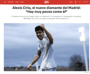 «La puesta en escena de Alexis Ciria en Valdebebas ha sido espectacular. El extremo de 18 años, flamante fichaje invernal procedente del Sevilla, no ha dejado indiferente a nadie en la semana que lleva como madridista: debutará este domingo, en el que los blancos reciben en Valdebebas al líder, el Rayo Majadahonda» (Marca)
