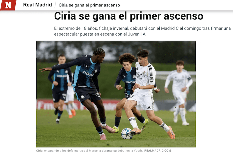 MARCA (Silvia Tamaral): «La puesta en escena de Alexis Ciria en Valdebebas ha sido espectacular. El extremo de 18 años, flamante fichaje invernal procedente del Sevilla, no ha dejado indiferente a nadie en la semana que lleva como madridista. Debutó con el Juvenil A en Copa del Rey marcando el gol decisivo en la prórroga, tuvo minutos en la goleada ante Unionistas y se ganó un sitio en el ‘once galáctico’ de la Youth League, plagado de castillistas y de algún jugador del Madrid C. Tres partidos le han valido a Ciria, en plantilla del Juvenil A, para ganarse el primer ascenso. El extremo ha brillado en cada una de sus actuaciones y el club le ha abierto las puertas del Real Madrid C. Ciria se incorpora al grupo de juveniles que están reforzando al equipo de Víctor Cea con el objetivo de salir de los puestos de descenso y debutará este domingo, en el que los blancos reciben en Valdebebas al líder, el Rayo Majadahonda. Junto a Manex Rezola y Arnu, Ciria será el tercer fichaje invernal que reforzará el Madrid C. El club, aparte del cambio de banquillo que realizó el pasado mes, lleva semanas en plena revolución de jugadores para sacar al Madrid C de la difícil situación clasificatoria que se encuentra. Aparte de fichajes (Arnu y Manex Rezola), también ha ascendido a los juveniles más destacados, como Javi Navarro, Lezcano, Beto, Lacosta, Bailón o Gabri Valero. Ahora le llega al turno a Ciria, como también a Melvin, que una vez recuperado de su última lesión y disputados algunos minutos con el Juvenil A, también reforzará al Madrid C este domingo para ocupar el lateral derecho».