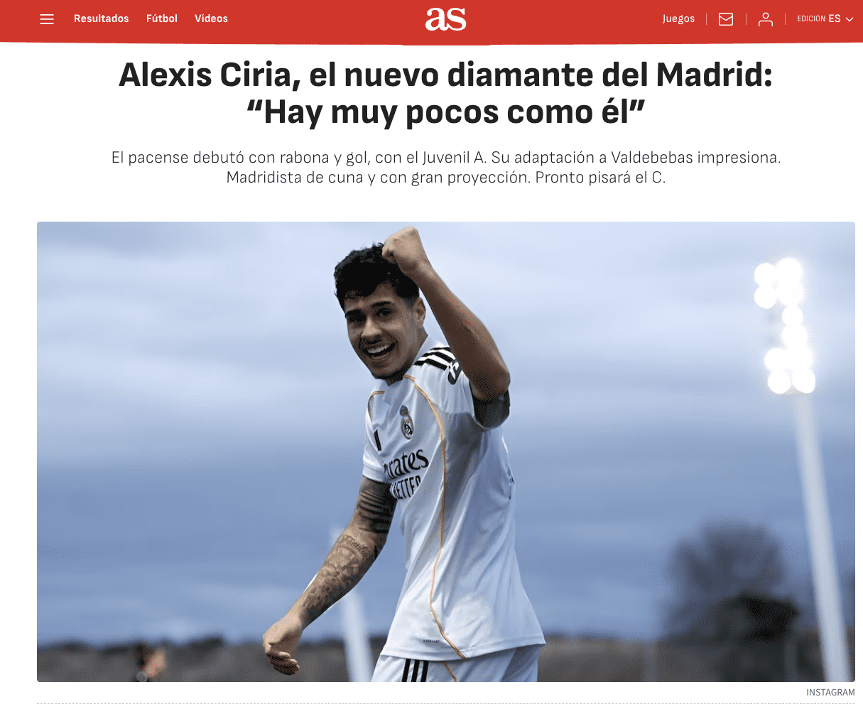 ALEXIS CIRIA: LA NUEVA «ESTRELLA» DE LA CANTERA BLANCA, CON LAS APUESTAS DIVIDIDAS SOBRE SI DEBUTARÁ O NO CONTRA EL RAYO MAJADAHONDA. La periodista Silvia Tamaral en Marca anticipa que «el club le ha abierto las puertas del Real Madrid C» y señala que Alexis Ciria se incorpora al grupo de juveniles que están reforzando al equipo de Víctor Cea con el objetivo de salir de los puestos de descenso y debutará este domingo, en el que los blancos reciben en Valdebebas al líder, el Rayo Majadahonda». Fernando S. Tavero en el diario AS es más precavido y señala que Alexis Ciria «es el nuevo diamante de La Fábrica. el Real Madrid C no aparece lejano. Lo pisará muy pronto. Ni tampoco se descarta el Castilla, aunque el plan marque el primer filial a partir del curso próximo. Todo supeditado a rendimiento, claro, pero con la confianza de que será ese, el rendimiento, su mejor aval». Y por ultimo Javier Rubiano, redactor de Bernabéu Digital, advierte: «Un fichaje para revolucionar el Real Madrid: llega una nueva estrella. Ascenso meteórico de Alexis Ciria, recién fichado del Sevilla, que debutará de forma inminente con el segundo filial madridista». En su crónica escribe que «el club ha decidido abrirle la puerta del Real Madrid C, donde se incorporará de inmediato al grupo que dirige Víctor Cea. El objetivo es sacar al filial del pozo. Ciria será el tercer refuerzo invernal del equipo, junto a Manex Rezola y Arnu, y podría debutar este mismo domingo en Valdebebas ante el Rayo Majadahonda, líder de la categoría», señala este periodista graduado en Lengua, Literatura Española y Periodismo por la Universidad Rey Juan Carlos que ha cubierto partidos de Primera y Segunda División, de Champions League, Primera RFEF y Copa del Rey.