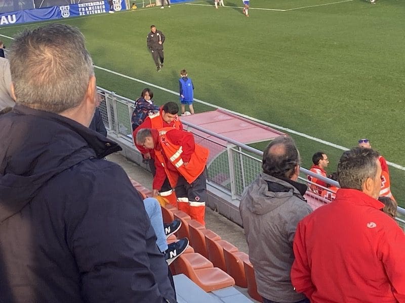 «Poco después daría el susto Babin en un encontronazo fortuito con Néstor. El futbolista majariego caía encima del de Martinica y el peso de ambos iba sobre el hombro izquierdo del capi alfarero que quedó en el suelo muy dolorido. Por suerte, tras varios minutos y las atenciones médicas el corajudo central podía volver a jugar. El gol le dio alas al Alcorcón. Es cierto que el conjunto local quería llevar la iniciativa, pero cada vez que el Alcorcón robaba, salía a gran velocidad por ambas bandas y jugando al primer toque. A los 39 minutos Chiki aprovechó un balón en largo al espacio para penetrar en el área y de remata un balón que por poco no se convertía en el segundo. Los alfareros estaban muy cómodos. El Rayo Majadahonda quizá fue más dominador con el esférico, pero su posesión no era capaz de generar ocasiones con claridad. La segunda mitad comenzó con un ida y vuelta de área a área. El Alcorcón con balones en largo a la espalda de la defensa. El Rayo Majadahonda con remates desde la frontal y centros al área. El partido era divertido para el espectador y seguro que lleno de nervios para los entrenadores. Rahim en el 58 probó con un potente disparo que detuvo Jesús Ruiz«.