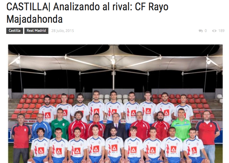 La revista del Real Madrid “Realidad Blanca” dedica en su último número, y bajo el título “Analizando al Rayo Majadahonda”, un exhaustivo informe sobre los rivales del Real Madrid-Castilla, donde destaca que el año pasado “fue una gran temporada del Majadahonda, donde siempre ofrecieron un gran fútbol”. Tras apuntar que “este año volverán a verse las caras con algún que otro jugador de la cantera madridista, que ahora militarán en el Real Madrid-Castilla de Zidane” (domingo 30 de agosto a las 19;30 horas en el Cerro del Espino), “Realidad Blanca” cuenta la historia del club majariego y recuerda que sus encuentros la temporada pasada con el ex segundo filial blanco (Real Madrid C) terminaron 1-1 en el Cerro, con goles de Portilla (10’) por parte del Majadahonda, y de Óscar Arroyo (69’), por parte de los madridistas. En la vuelta en Valdebebas, el encuentro terminó en 1-0 para los blancos, con un gol de Cristian Cedrés en el 62’. Los encuentros entre Rayo Majadahonda y Real Madrid-Castilla serán el 30 de agosto en el Cerro del Espino (jornada 2) y 16/17 de enero en el Alfredo Di Stéfano (jornada 21).