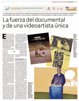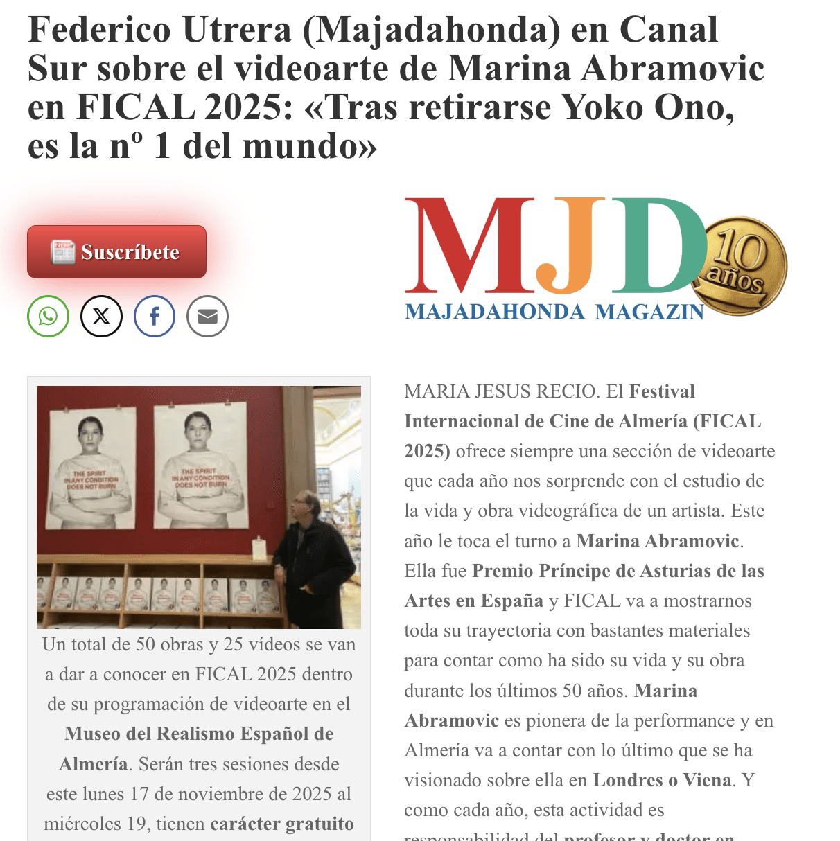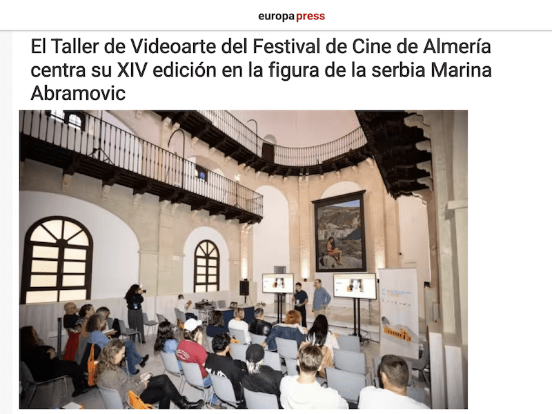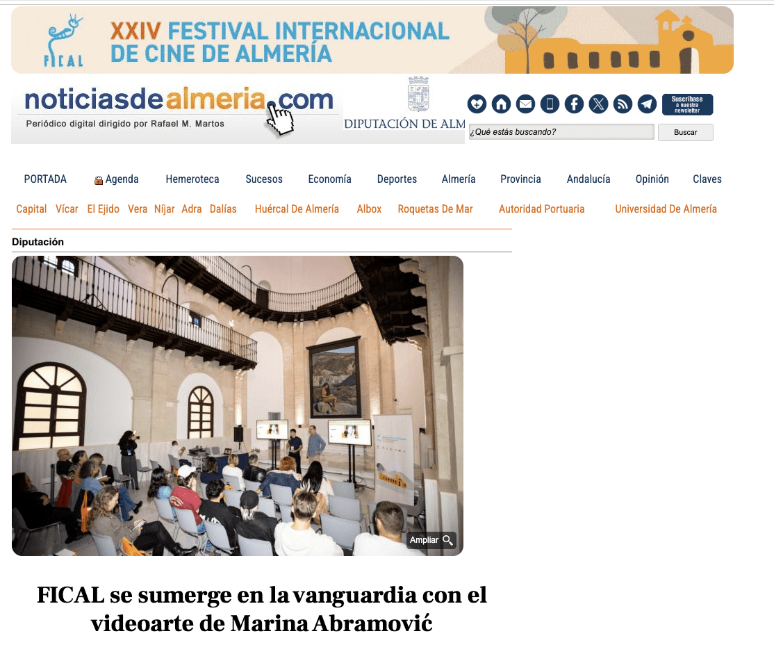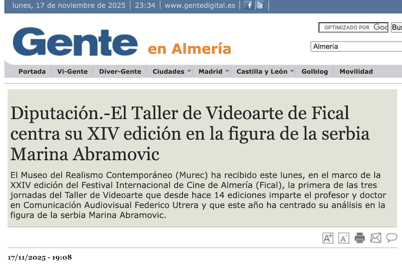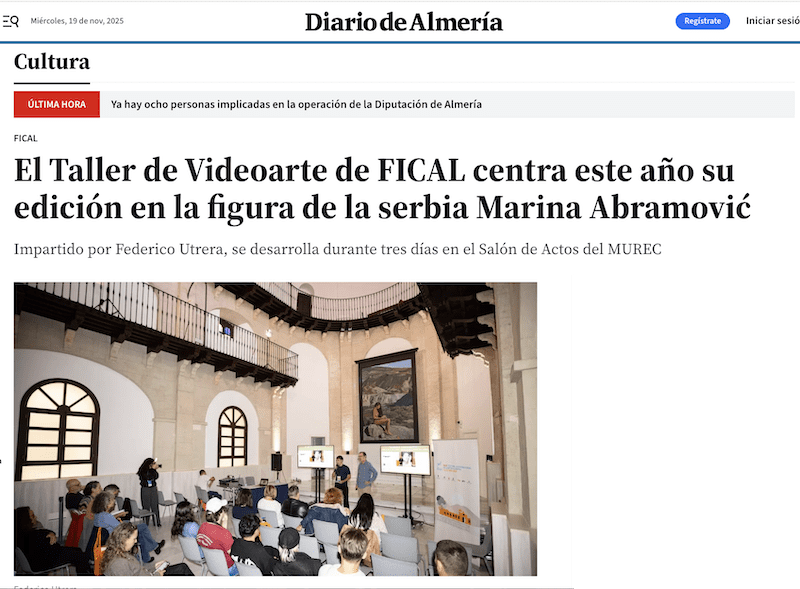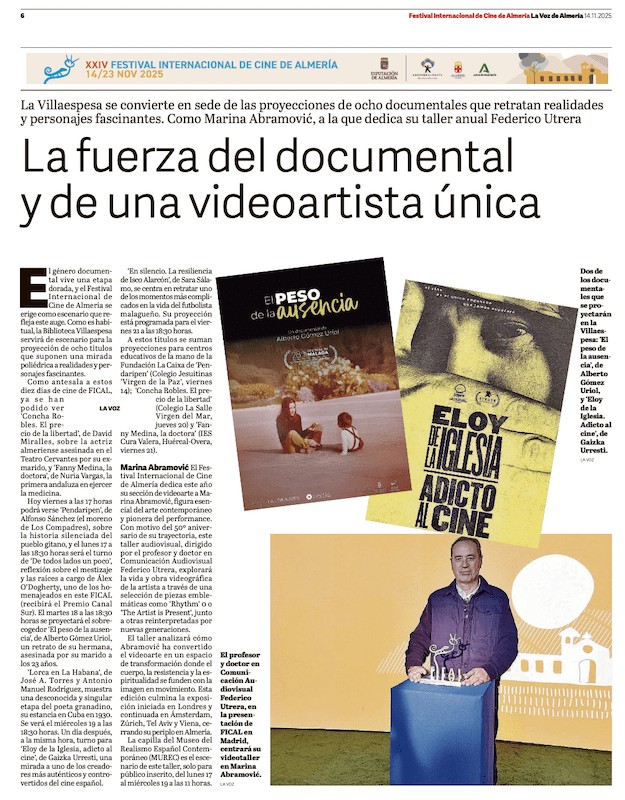 MANU RAMOS. El Festival Internacional de Cine de Almería finalizó este sábado 22 de noviembre (2025) en el Auditorio Maestro Padilla durante una Gala de Clausura que reunió a numerosos directores de cine, actores y técnicos cinematográficos con miembros de la sociedad civil almeriense. Entre los participantes de esta edición estuvo el profesor y Doctor en Comunicación Audiovisual, Federico Utrera, almeriense residente en Majadahonda (Madrid) que impartió el taller de videoarte titulado «Marina Abramovic: 50º Aniversario», sobre la vida y obra de la perfomer y videoartista, premio Príncipe de Asturias de las Artes. Y este año además con récord de participación: 33 alumnos se inscribieron en el curso, que además ha tenido un fuerte impacto en los medios de comunicación. Televisiones nacionales como los Informativos de Mediaset (Tele 5), agencias como Europa Press, los diarios locales La Voz de Almería y Diario de Almería, los medios digitales Noticias de Almería, Gente o Almería Noticias o las entrevistas en las emisoras radiofónicas Canal Sur y Dipalme Radio (Diputación) fueron algunas de las reseñas que obtuvo este curso, que concluyó con una foto de familia entre algunos de los especialistas o simples degustadores del videoarte que participaron en el mismo.