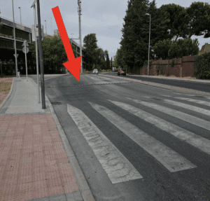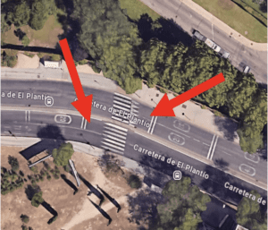 Paso de peatones cercano a la parada de autobús “Ctra.Plantío-Urb.La Sacedilla” con los «resaltos» ilegales.