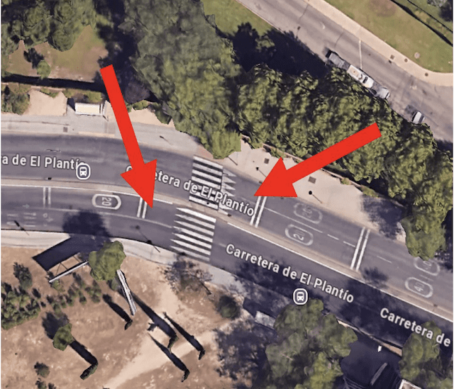 Paso de peatones cercano a la parada de autobús “Ctra.Plantío-Urb.La Sacedilla” con los «resaltos» ilegales.