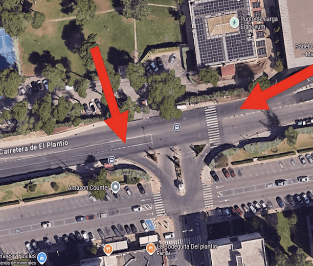 Ubicación y Documentación Fotográfica de Reductores de Velocidad (Majadahonda). Se adjunta información gráfica y de localización relativa a los 6 reductores de velocidad instalados en la Carretera del Plantío (Majadahonda). Se documentan en pares según su ubicación: 2 reductores en el primer paso de peatones sobreelevado, 2 en el segundo paso de peatones sobreelevado, y 2 en la intersección semaforizada. Para cada par se indica la ubicación y se incluyen fotografías in situ. En esta primera imagen se indica la situación de los 3 pares de reductores, que se detallan en esta misma página.