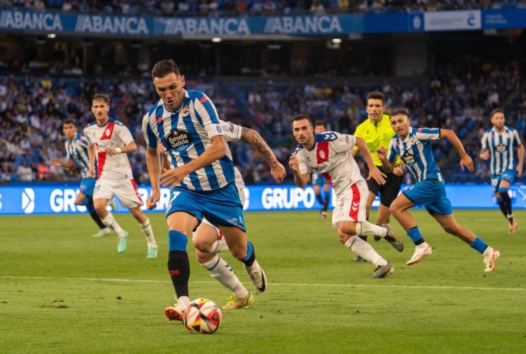 Jugada del gol anulado al Dépor en Riazor frente al Rayo Majadahonda en el primer partido de liga 23/24: un jugador deportivista hace de pantalla dentro del área en claro fuera de juego aunque no intervenga y al fondo Lucas Pérez se encuentra aparentemente en línea o un poco más adelantado, lo que sería fuera de juego. Sin VAR es imposible determinar con precisión el centímetro que decide la irregularidad salvo para el árbitro y linier, que coincidieron en anular la acción