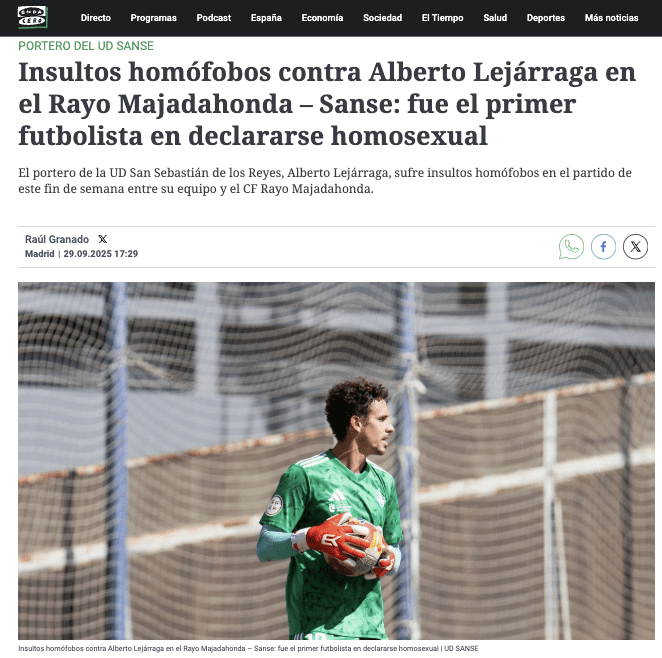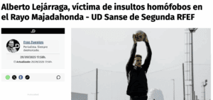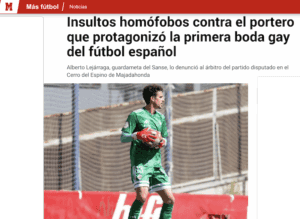 MARCA (Julia del Mar): Insultos homófobos contra el portero que protagonizó la primera boda gay del fútbol español. Alberto Lejárraga, guardameta del Sanse, lo denunció al árbitro del partido disputado en el Cerro del Espino de Majadahonda. Lamentables insultos homófobos al portero del San Sebastián de los Reyes, Alberto Lejárraga, se escucharon ayer en el Cerro del Espino en el partido entre el Rayo Majadahonda y el conjunto sansero. Así lo reflejó en el acta el árbitro del encuentro, Joan Masip Vidal: «El guardameta del conjunto visitante se ha dirigido a mi persona indicándome que desde la grada le habían hecho comentarios homófobos, con los términos de ‘maricón’ en repetidas ocasiones. Los aficionados situados detrás de la portería los aficionados que proferían los insultos “estaban identificados con atuendos deportivos y banderas del conjunto local”. Alberto Lejárraga es el primer futbolista español que ha declarado públicamente que es homosexual. Lo hizo en abril de 2023, cuando era futbolista en el Marbella, tras conseguir el ascenso con su equipo. Este verano se ha casado con su pareja, protagonizando la primera boda gay en el fútbol español.