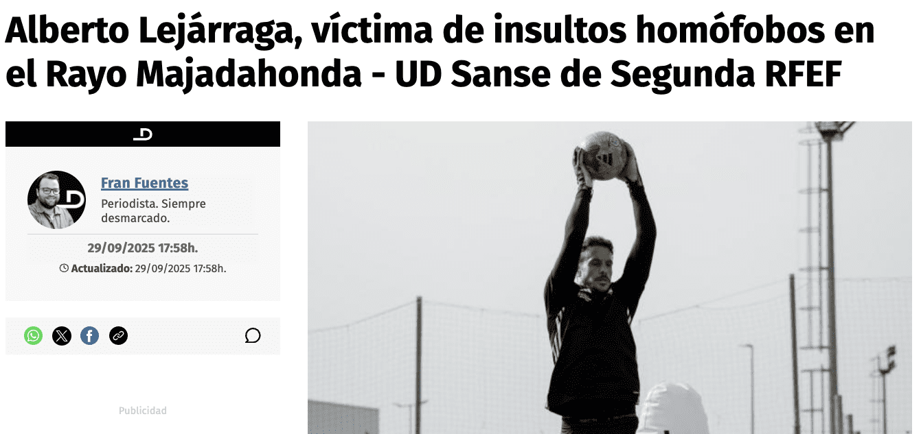 EL DESMARQUE: El fútbol español vuelve a vivir un episodio de violencia verbal en los terrenos de juego. La UD San Sebastián de los Reyes ha denunciado los insultos homófobos que sufrió su portero, Alberto Lejárraga, durante el encuentro frente al Rayo Majadahonda en la Segunda RFEF, disputado en el Cerro del Espino. De este modo, el club madrileño ha emitido un contundente comunicado para denunciar estos comportamientos. La entidad ha expresado su rechazo absoluto a estos insultos recordando que el club agradece tanto al colegiado del encuentro como al Rayo Majadahonda su rápida actuación ante los hechos, y confía en que se tomen medidas necesarias para que situaciones similares no vuelvan a repetirse. El caso ha generado también la reacción de la Asociación de Futbolistas Españoles (AFE), que mostró su respaldo público a Lejárraga a través de un comunicado en redes sociales. “Desde AFE condenamos los gritos homófobos sufridos por nuestro compañero. El fútbol es un deporte que debe unir y nunca puede ser un espacio para el odio o la intolerancia”, señalaron, añadiendo que la diversidad “nos enriquece” y que el respeto debe ser siempre “innegociable”. Lejárraga, guardameta del Sanse desde 2022, ya se ha mostrado en otras ocasiones como un firme defensor de la visibilidad y la inclusión en el deporte. Los hechos ocurridos en el partido vuelven a poner sobre la mesa la necesidad de erradicar la homofobia de los estadios de fútbol y de proteger a los jugadores que sufren este tipo de ataques.