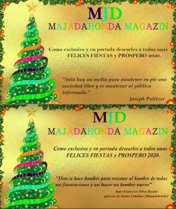 MANU RAMOS. Más de un centenar de instituciones y personalidades de Majadahonda han felicitado la Navidad 2019 a MJD Magazin con mensajes, tarjetas de Navidad y vídeos de todo tipo, a cada cual más original y sorprendente. Con ello se evidencia que no se pierden las buenas costumbres, y una de ellas es la de felicitar a los congéneres, hacer borrón y cuenta nueva con el año que termina y llenarse de esperanza y buenos sentimientos para el futuro. La mayoría ha respondido a la doble felicitación navideña (religiosa y laica) que había emitido este medio de comunicación con los mensajes del padre del periodismo de investigación, Joseph Pulitzer, y del párroco majariego Francisco Pérez Ruano. Y como hacemos todos los años, proporcionamos un resumen de los mismos. «Feliz navidad y un abrazo», escribió el alcalde, José Luis Álvarez Ustarroz (PP); «Feliz Navidad a Majadahonda Magazin con todo mi cariño», indica el mensaje de Ana Elliot (Cs). Y entre los concejales el más original fue Eduardo González Camino, responsable de Deportes: «Feliz Navidad, seguro que la portada del Majadahonda Magazin en 2020 se llenará de los éxitos deportivos de los clubes de nuestra ciudad. Y daréis buena cuenta del Carnaval, el Judas, las Fiestas Patronales… un abrazo». José Rodríguez (Vox) envió una tarjeta navideña y su compañero de escaño Pedro Mallén un mensaje: «Feliz Navidad, disfrutad mucho de esta Nochebuena y del Día de Navidad en compañía de lo que más quieres». También felicitó a MJD Magazin el secretario general del PSOE, Borja Cabezón y gustó en la redacción la del concejal socialista Antonio Sanz: «Feliz Navidad a todos los que hacéis posible Majadahonda Magazin». También se han recibido felicitaciones de Carlos Bonet (Vecinos por Majadahonda) y Juancho Santana (ex concejal de IU). Otras felicitaciones destacadas son las de el ex entrenador del Rayo Majadahonda, Antonio Iriondo, quien envía junto a las banderas de España y de la India, un cariñoso mensaje que concluye con la palabra más citada estos días: «¡Felicidades!». También José María Sanz y Pedro Arribas, consejero delegado y presidente de Rayo Majadahonda SAD, el director deportivo del club, Óscar Carazo, Jacinto Santodomingo, ex presidente del Círculo de Empresarios, el gastrónomo Víctor Hernández (Virgen de Icíar), Carmen Perujo (Escultora): «Feliz Navidad y que tengáis un buen año 2020»); Coke Fernández (músico de «Magara»), Vicente Colilla (Educación), Karlos Gordovil (Hockey Hielo), los entrenadores Manu Alcázar, Jonatan Alba, Manuel Cerdán, José María Rico, el ex capitán David Ballester, los cronistas Zacarías Maíllo, Gregorio Mª Callejo, Tomás Hernández, Julia Gallego… y así hasta más de un centenar, que son los siguientes: