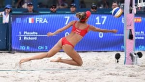 La majariega «daría el susto a la con un golpe contra el poste de la red que frenó el juego español tras una gran jugada defensiva. Tania Moreno se recuperaba durante el tiempo médico, y regresaba a la pista para cerrar el set con un remate a la línea por 12-21. La dinámica de las españolas se mantuvo en el inicio del segundo set. Las francesas mejoraban en recepción para conseguir más continuidad en sus acciones ofensivas, nivelando el marcador. La serenidad de Tania Moreno y Daniela Álvarez tuvo su recompensa tras el empate a 6, frenando el ímpetu de las francesas guiadas por los ánimos de los más de 10.000 espectadores del Estadio de la Torre Eiffel. Las españolas forzaban numerosos errores de la dupla francesa que elevaban la distancia hasta los cinco puntos (8-13) en el tiempo técnico. Tania Moreno y Daniela Álvarez caminaban firmes hacia el triunfo y con el esfuerzo defensivo de la madrileña y los ataques de la asturiana llevaban el marcador hasta el definitivo 15-21. El sábado 3 de agosto se completará la fase de grupos para la madrileña y la asturiana. Tania Moreno y Daniela Álvarez se enfrentarán a las 12 horas con las germanas Laura Ludwig y Louisa Lippmann en busca de un lugar en las eliminatorias».