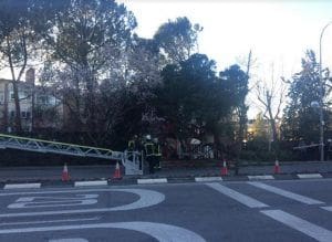 JULIA BACHILLER. Las fuertes ráfagas de viento siguen causando estragos en Majadahonda. En esta ocasión un árbol ha caído en la avenida de los Reyes Católicos en un lugar cercano a la rotonda del antiguo Pryca en confluencia con la avenida de Guadarrama. Como muestran las imágenes, un enorme pino situado en los jardines de la Urbanización de las Huertas se desplomó sobre la marquesina de la parada del autobús provocando grandes destrozos en ella. Fuentes policiales consultadas por MJD Magazin han confirmado que ninguna persona ha resultado herida debido a esta caída y que este es el cuarto árbol derribado por el temporal de viento en la ciudad en lo que va de semana. Las imágenes fueron tomadas a las 19:00 horas y en el lugar ya se encontraban dos coches de bomberos y policía local. El acceso de entrada por los dos carriles al centro de Majadahonda ha estado cerrado al tráfico durante la intervención de los bomberos mientras realizaban la labor del corte de las ramas y la base del árbol, dejando la marquesina precintada. Sobre las 20:00 horas las intervenciones habían finalizado y el tráfico quedaba restaurado en dicha vía.