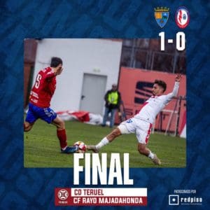 FICHA DEL ENCUENTRO. Rayo Majadahonda (4-2-3-1): C. Sarr (2); G. Rodríguez (2), Kike Hermoso (2), Pelayo Suárez (2) (Samu Expósito, 77´) (2), Jorge Casado (2); Reguera (2), Raúl Tavares (2) (Enri, 87´) (2); Sergio Navarro (2), Pablo Pérez (2) (Cortés, 59´) (2), Sergi García (2) (Jeisson, 87´) (2); Alberto Fernández (2). Entrenador: Jon Erice (2). CD. Teruel (4-2-3-1): Taliby, Víctor Sanchis, Sierra, Arnau Gaixas, Julen; Fran Tena, Borja Romero; David Aparicio (Villa, 81´), Nacho Castillo, Borja Martínez; Toni Gabarre (Naranjo, 70´). Entrenador: Raúl Jardiel. Arbitros (1): Colegio valenciano, Álvaro Cánovas García Villarrubia (principal), Jiménez Contreras (asistente), Ricard Esteve (asistente), Casabona Isla (4° árbitro). Goles: 1-0 (Borja Martínez, 29´). Tarjetas: amarillas, Alberto Fernández (26´), Sergi García (33´), Víctor Sanchís (47´), Raúl Tavares (60′), Nacho Castillo (72´), Tena (78´), Julen Hualde (94´).