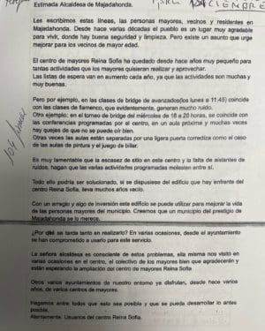 El 4 de octubre de 2021 la plataforma digital «Change.org» recogía una iniciada de la Asociación Vecinal de Majadahonda en apoyo a los usuarios del Centro de Mayores Reina Sofía y con ello se iniciaba una recogida de firmas exigiendo «que se cumpla el punto 20 del programa electoral del Partido Popular: ampliar el Centro de Mayores anexando las dependencias de la Concejalía de Servicios Sociales, y que lo haga ya». El 1 de mayo de 2022 el alcalde de Majadahonda aseguró ante la presidenta de la Comunidad de Madrid durante un mitin celebrado en el Parque de Colón: “vamos a tener una nueva biblioteca, estamos proyectando la Ciudad de las Artes, un espacio de coworking, vamos a reformar polideportivos, a estrenar nuevas infraestructuras…”. No se mencionó para nada la ampliación del Centro de Mayores, por lo que a sus usuarios les escamó tal ausencia. El 23 de mayo de 2022, durante la celebración de la Semana del Mayor, la concejal responsable disculpó la ausencia del alcalde y tras la insólita manifestación de los propios mayores ante el Consistorio, declaró: «No me olvido de la ampliación del centro de mayores que el alcalde os anunció, que no avanza como todos quisiéramos, pero puedo garantizaron que sí que lo van a hacer».