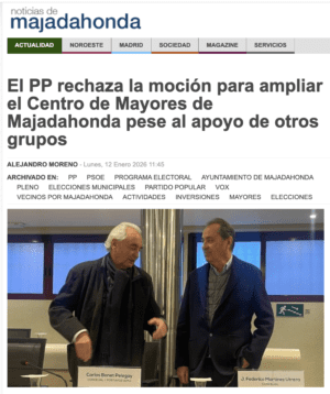 MANU RAMOS. (Majadahonda, 16 de enero de 2026). «La mayoría absoluta del Partido Popular (PP), partido que gobierna el municipio de Majadahonda desde hace 38 años (desde 1989), rechazó en el último pleno del Ayuntamiento celebrado el 18 de diciembre de 2025, una moción del grupo municipal de “Vecinos por Majadahonda” en la que insta al Equipo de Gobierno a cumplir la iniciativa aprobada en el pleno del celebrado en el mes de mayo de 2024, priorizando y procediendo a la realización de cuantos trámites sean necesarios “para la ampliación en 2026 del actual Centro de Mayores “Reina Sofía” utilizando para ello el edificio municipal contiguo de la calle Viento y habilitando otros espacios para ampliar la oferta de actividades y servicios para nuestros mayores”, señala un comunicado, que ha tenido un amplio eco en los medios de comunicación. Los votos del PP (15) derrotaron la propuesta vecinal defendida por el concejal Federico Martínez, que contó con el respaldo de 10 votos correspondientes a Vox (Fernández de la Puente), PSOE (Elisa Piñana) y Más Madrid-IU (Daniel Pérez).