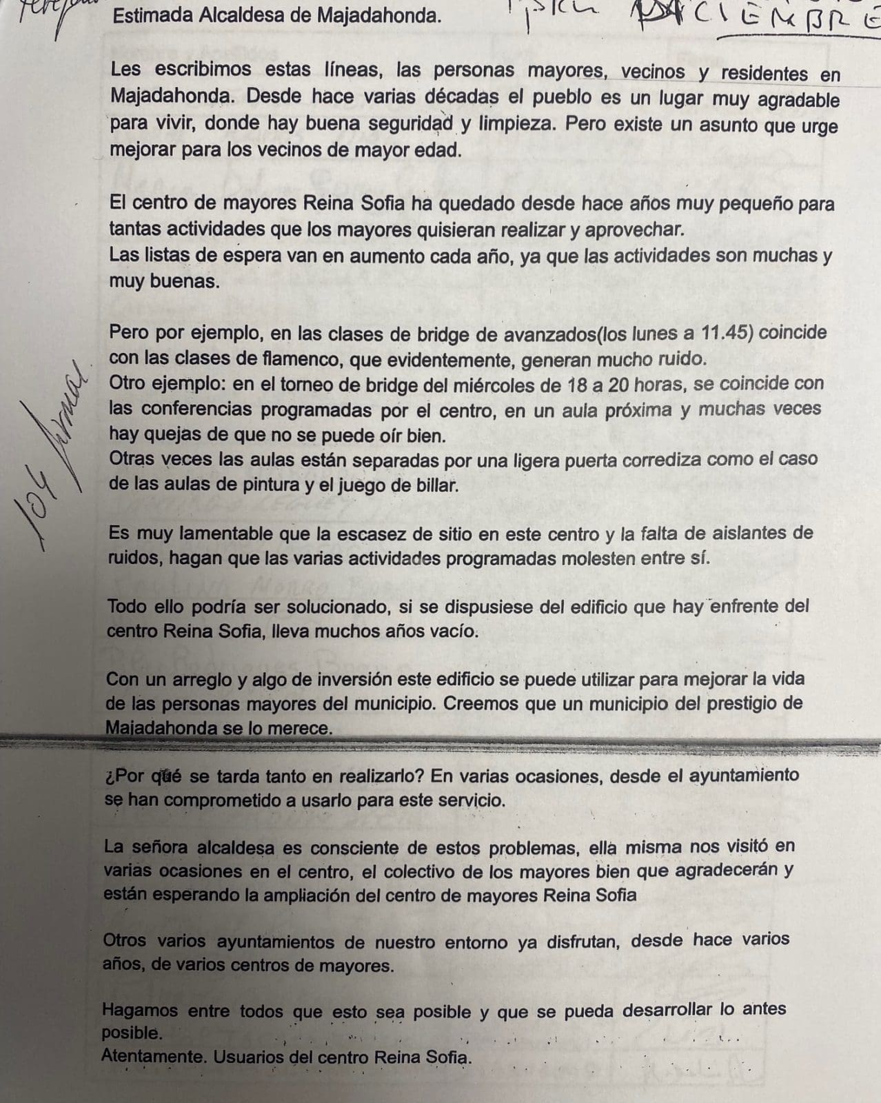 LOS VECINOS SE MOVILIZAN Y HACEN LLEGAR UNA CARTA CON MÁS DE 100 FIRMAS. «Un grupo de vecinos se había dirigido al Grupo Municipal de «Vecinos por Majadahonda” a finales de año presentando un escrito con más de 100 firmas y recordando que el 28 de mayo de 2024, hace ahora año y medio, presentamos una moción que fue aprobada por todos los grupos municipales de este pleno y que contaba con una enmienda transaccional del Grupo Popular que decía lo siguiente: «Que el Ayuntamiento de Majadahonda priorice y proceda a la mayor brevedad posible a la realización de cuantos trámites sean necesarios para la ampliación del actual Centro de Mayores “Reina Sofía” utilizando para ello el edificio municipal contiguo de la C/ Viento y habilite, si así fuera necesario, otros espacios para ampliar la oferta de actividades y servicios para nuestros mayores”, defendió el concejal y portavoz adjunto, Federico Martínez.