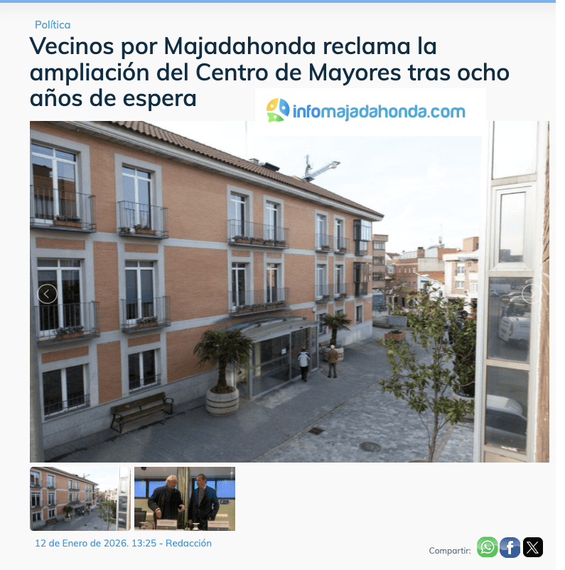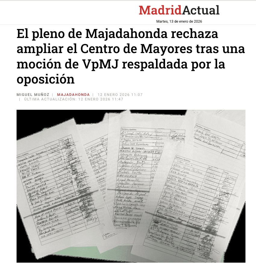 MANU RAMOS. (Majadahonda, 16 de enero de 2026). «La mayoría absoluta del Partido Popular (PP), partido que gobierna el municipio de Majadahonda desde hace 38 años (desde 1989), rechazó en el último pleno del Ayuntamiento celebrado el 18 de diciembre de 2025, una moción del grupo municipal de “Vecinos por Majadahonda” en la que insta al Equipo de Gobierno a cumplir la iniciativa aprobada en el pleno del celebrado en el mes de mayo de 2024, priorizando y procediendo a la realización de cuantos trámites sean necesarios “para la ampliación en 2026 del actual Centro de Mayores “Reina Sofía” utilizando para ello el edificio municipal contiguo de la calle Viento y habilitando otros espacios para ampliar la oferta de actividades y servicios para nuestros mayores”, señala un comunicado, que ha tenido un amplio eco en los medios de comunicación. Los votos del PP (15) derrotaron la propuesta vecinal defendida por el concejal Federico Martínez, que contó con el respaldo de 10 votos correspondientes a Vox (Fernández de la Puente), PSOE (Elisa Piñana) y Más Madrid-IU (Daniel Pérez).