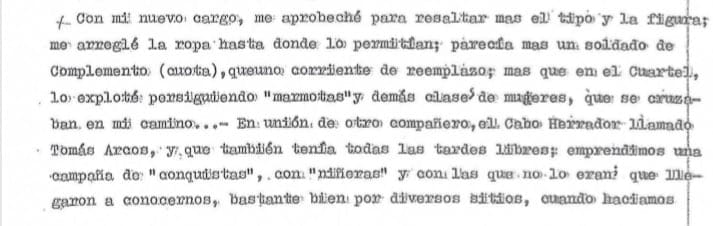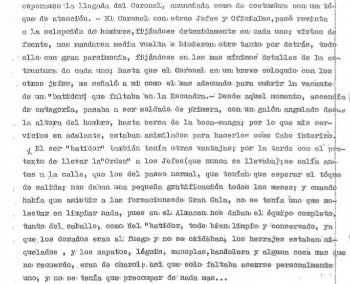 CRESCENCIO BUSTILLO. Por si era poco con mi empleo, se dio el caso curioso de que antes de jurar el Estandarte, me hicieron *‘batidor’, el equivalente a ser ‘gastador’ en Infantería. Una tarde después de comer, nos mandaron formar en el escuadrón y eligieron 5 hombres de los más altos y mejor formados. Entre ellos estaba yo. Nos llevaron a los pasillos de Mayoría, junto a la vivienda del coronel, Don Adolfo Perinat Torreblanca, un hombre ya mayor, con el pelo blanco, que después se moriría de repente en un banquete que conmemoraba un triunfo de los caballos del Regimiento. Cuando llegamos a los pasillos de Mayoría, había una treintena de hombres sacados como a mí de los distintos Escuadrones. Juntos todos formamos en el pasillo, dejando el centro del mismo libre, y poniéndonos de espalda a la pared…