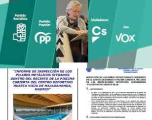 A los pocos días hablé con alguien en la Concejalía (de Deportes), no sé quién es, no puedo decir con quien hablé en la Concejalía, alguien me pasó y no escuché si me decían algún nombre o no. Cuando fui a pedir explicaciones de cuánto va a durar esto y que va a pasar, fue muy interesante porque me comentaron que conocían el problema, porque hacía unos años lo habían tenido en las columnas que había entre los dos vasos de la piscina: “Pero mire no hay mayor problema, sabemos cuál es el problema, también sabemos la solución. La solución está en encamisar las columnas”. Yo soy una ignorante, no conocía y era la primera vez que oía la palabra «encamisar«, pero cuando me lo explicó me di cuenta que sí, que estaba muy bien. Me di cuenta que conocían el problema y conocían también la solución, lo cual no está mal. En un momento determinado, estoy hablando del mes de septiembre, -y han hablado de trasparencia pero no supimos nada más, salvo rumores– conocimos la existencia de unos informes que debieran ser esenciales a la hora de tomar una decisión. Pero no los hemos conocido hasta que la semana pasada, cuando los «Vecinos por Majadahonda«, yo por lo menos lo sé por ellos, tuvieron la deferencia de hacerlos públicos, cosa que no había hecho su Ayuntamiento. Y les miro a todos los pertenecientes al Ayuntamiento.