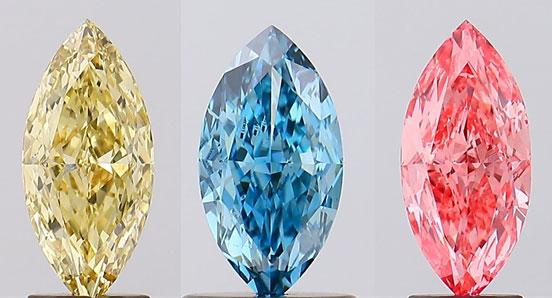 Diamantes de laboratorio de color amarillo canario, azul intenso y rosa intenso