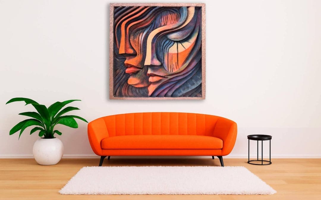 Entre las obras actualmente disponibles se encuentra «Alma Reflejada», una escultura que representa la intimidad madre-hija en un gesto de unión profunda, con cabellos entrelazados que evocan raíces compartidas sobre un fondo turquesa vibrante. «Árbol de la vida» transmite el ciclo vital a través de ramas curvadas, frutos naranjas y un ave que observa serena, todo enmarcado en tonos tierra y patrones geométricos. «Con la mente en blanco» retrata un rostro de piedra con una grieta abierta, en un momento suspendido de silencio mental sobre fondo rojo, evocando los vacíos del pensamiento.