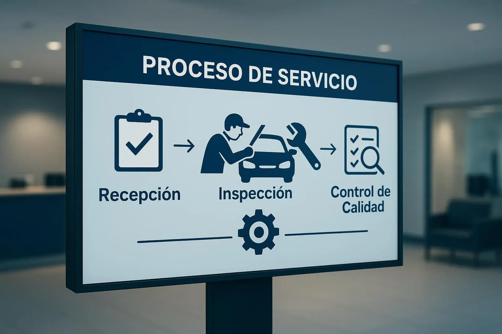 La señalización digital ayuda a explicar de forma clara muchos procesos internos de un concesionario. En el departamento de servicio, se pueden mostrar con detalle: