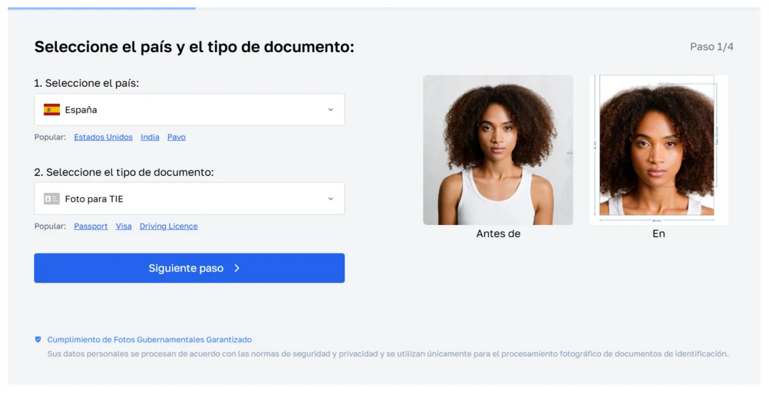 Todo el procedimiento lleva un par de minutos. Basta con subir su imagen, seleccionar en el menú el país (España) y el tipo de documento (Foto para TIE), y el sistema ajustará la fotografía automáticamente. El servicio cumple con precisión los parámetros para la foto del TIE, y todos los requisitos se actualizan según las últimas normas.