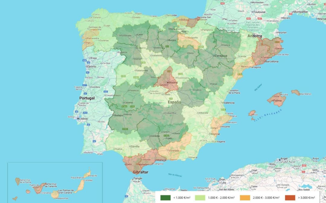 Las mayores cifras se concentran en áreas metropolitanas y destinos turísticos de alta demanda. Las provincias con la oferta de viviendas más caras son las que tienen grandes áreas metropolitanas o se encuentran en las zonas costeras e islas donde los precios pueden superar los 4.000 €/m²:
