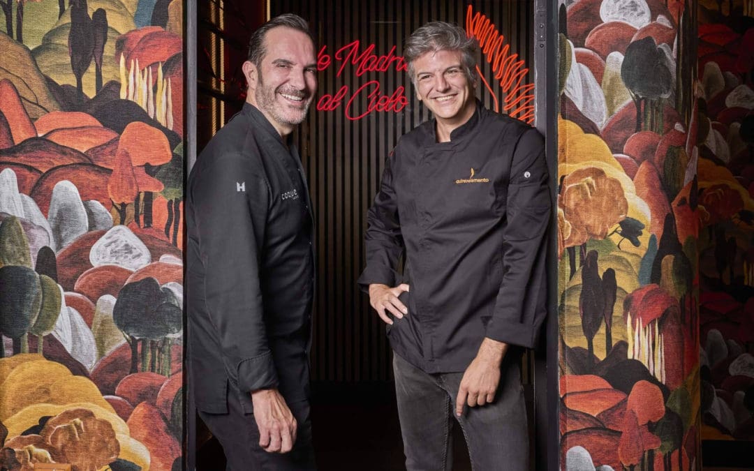 En los platos principales, Sandoval presenta la sopa de cangrejo granizada con quisquilla ahumada, maíz tostado con ají, huevas de trucha y shots de curry verde; el escabeche antiguo de besugo al estilo Madrid, orégano, alcaravea y cilantro, con guiso de colmenilla al Oporto, foie y caviar Osetra; y la galantina de aves del Pardo: codorniz engrasada, perdiz roja, pichón de tiro y pularda con demi-glace, nueces, ajo de Chinchón y salsa gastrónada de almendra y azafrán. Por su parte, Suárez de Lezo firma el guiso de sepia y tendones con encurtidos y crujiente de tapioca, la ventresca de lubina con shiitake y fideos en fondo de jengibre, y la muselina de carabinero y pollo con glaseado de ave montado con aceite de carabinero y gallete crujiente de piel de pollo con sus interiores y yema de huevo.
