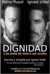Dos actores estrenan una obra de teatro virtual desde un plató de Boadilla: se titula «Dignidad» y habla de corrupción política. Boadilla estrena el próximo martes, 2 de junio, a las 22,00 horas a través de la página web www.vuvuzela.es (en la que se pueden también adquirir las entradas), la obra de teatro «Dignidad», escrita y dirigida por Ignasi Vidal. El mismo actor la interpreta junto a Pablo Puyol.