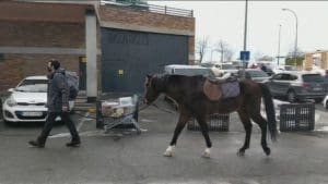 MANU RAMOS. Vuelve el transporte a caballo a causa de la «gran nevada» 2021 aunque sea por un día. Y lo ha hecho en Majadahonda gracias a Jorge López Valdivieso, adiestrador de la escuela, director en TecniCan Educación Canina. La emisora de TV La Sexta lo cuenta así: «La nieve y las placas de hielo permanecen en las carreteras y calles de los municipios de la Comunidad de Madrid una semana después del paso de la borrasca Filomena y dificultan aún el tráfico. Por ello, algunos no han dudado en usar otros medios de transporte, por muy inusuales que sean, para poder llenar la nevera. Es el caso de un joven, vecino de la localidad de Majadahonda, que ha decidido ir a lomos de su caballo hasta el Mercadona del pueblo. «Hemos tenido que venir al pueblo a por víveres», cuenta en un vídeo en el que demuestra cómo el camino que ha recorrido con el animal hasta el supermercado sigue completamente lleno de nieve.