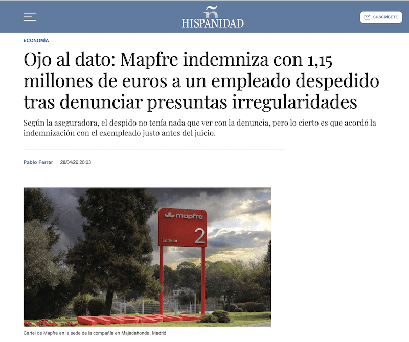 MANU RAMOS (Majadahonda, 29 de abril de 2026). El periodista Pablo Ferrer del diario “Hispanidad” ha publicado la siguiente noticia: “Ojo al dato: Mapfre indemniza con 1,15 millones de euros a un empleado despedido tras denunciar presuntas irregularidades. Según la aseguradora, el despido no tenía nada que ver con la denuncia, pero lo cierto es que acordó la indemnización con el ex empleado justo antes del juicio”. La información añade que Mapfre “ha acordado indemnizar con 1,15 millones de euros a un empleado, abogado de profesión, con 30 años en la empresa, despedido después de que este denunciara presuntas irregularidades”. Y explica que “los hechos se remontan a 2020 y a “Cementerio Jardín”, la empresa funeraria participada por Mapfre y el Ayuntamiento de Alcalá de Henares. Ese año, según el denunciante, la empresa fichó a un familiar de un consejero de la aseguradora, al que después elevó a un cargo mejor retribuido”.