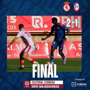 Acaba el partido en el Reino de León. La Cultural logra llevarse los tres puntos tras un partido bastante igualado contra el Rayo Majadahonda. Satisfacción de la grada y del equipo leonés tras la segunda victoria seguida en casa (2-1)