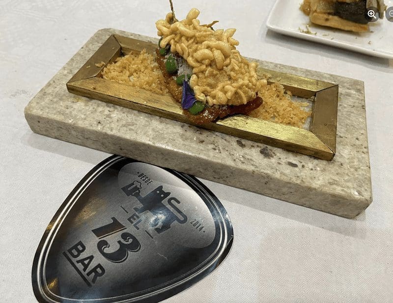 Lo ideó, con la ayuda de su compañero Gerardo, la vimos elaborarlo, tras la barra art-decó del restaurante: una coca con tomate concassè, tapenade de oliva negra y bocarte del Cantábrico en escabeche de cítricos. Lo acompañé con un blanco Godello. Ni qué decir que en este Hotel veraneó Rubén Darío, en los años 1905 al 1909. Bebió absenta, comió poco y escribió poemas. Acá uno de 1905, «Amo, amas», que escribió mirando al Nalón, desde la galería que muestro en una de mis fotos: «Amar, amar, amar, amar siempre, con todo el ser y con la tierra y con el cielo, con lo claro del sol y lo oscuro del lodo: Amar por toda ciencia y amar por todo anhelo. Y cuando la montaña de la vida nos sea dura, y larga y alta y llena de abismos… Amar la inmensidad que es de amor encendida ¡y arder en la fusión de nuestros pechos mismos!». Vea más pinchos del prestigioso Concurso del Nalón (Asturias):