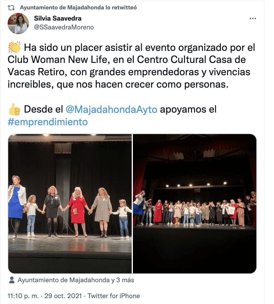 La otra noticia del PP alude precisamente a la sustituta de la concejala recién casada Victoria Wharrier, que cumple sus primeros seis meses de su segundo matrimonio. Y si «Vicky» Wharrier era residente en el distrito madrileño de Retiro cuando era concejala en Majadahonda y ahora en Pozuelo, su sustituta en Comercio, Silvia Saavedra, también se jacta de ello: «Ha sido un placer asistir al evento organizado por el Club Woman New Life, en el Centro Cultural Casa de Vacas Retiro, con grandes emprendedoras y vivencias increíbles, que nos hacen crecer como personas. Desde el Ayuntamiento de Majadahonda apoyamos el emprendimiento«, señala sobre su asistencia al acto en la capital. Este «club» con sede en la calle madrileña de Príncipe de Vergara se define como «una comunidad de mujeres con propósitos de crecimiento personal, emocional y económico. Mujeres con la madurez y la experiencia suficiente; para saber y reconocer lo que queremos en la vida. Un grupo de emprendedoras con una misma visión : Comprometidas con nosotras mismas y con las mujeres emprendedoras a sacar nuestra mejor versión. Con acciones formativas dirigidas a incrementar el liderazgo de las mujeres emprendedoras».