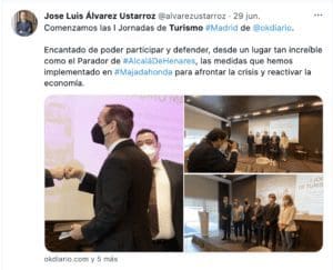 LIDIA GARCIA. El alcalde de Majadahonda, José Luis Alvarez Ustarroz, difundió una nota pública con su foto el pasado 29 de junio (2021) en la que afirmaba: «Comenzamos las I Jornadas de Turismo Madrid de OKdiario. Encantado de poder participar y defender, desde un lugar tan increíble como el Parador de Alcalá de Henares, las medidas que hemos implementado en Majadahonda para afrontar la crisis y reactivar la economía». El PP apoyaba al día siguiente su mensaje con otro parecido: «¿Te perdiste ayer la mesa de debate en la que participó Alvarez Ustarroz dentro de las Jornadas de OKdiario?: «La libertad que tenemos nos da la posibilidad de impulsar un turismo de calidad». Trece días después, una diputada de la Asamblea de Madrid ha desvelado cuanto costó la «fiesta» de oír hablar de turismo al alcalde, cuya profesión ha sido la de perito de la aseguradora Mapfre en calidad de licenciado en Derecho, después de sus vicisitudes con el Colegio de Abogados de Madrid. Ha sido «El Boletín» quien ha dado la noticia bajo el siguiente titular: «Ayuso da a dedo 50.000 euros a ‘OK Diario’ para patrocinar unas jornadas de turismo. La Comunidad de Madrid adjudicó un contrato sin publicidad a Dos Mil Palabras SL, empresa titular del diario digital». Y en ella se recoge una declaración: “Las mamandurrias continúan en el Gobierno de Ayuso”, ha afirmado la portavoz de Unidas Podemos en la Asamblea de Madrid, Carolina Alonso, que muestra una imagen de la adjudicación. Y añade: «otra vez patrocinadas por la Consejería de Cultura, Turismo y Deporte de Marta Rivera, ex Ciudadanos y que ya la dirigía en la legislatura anterior. Primero el chiringuito de Toni Cantó. Ahora un patrocinio a OK Diario».