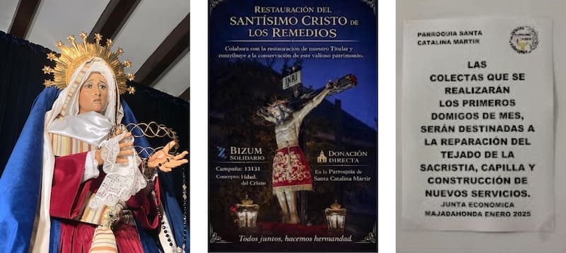 La Parroquia principal de Majadahonda, Santa Catalina Mártir, edificio emblemático del municipio, precisa de reformas y destina las colectas de los primeros domingos de mes a este fin. Plantearse firmar un convenio de colaboración con la Parroquia o la Hermandad para sufragar parte de esos costosos gastos, al ser una entidad privada de uso público y sin fines lucrativos al igual que las anteriores mencionadas, sería una decisión por muchos bien recibida. Recientemente el Ayuntamiento ha solicitado la participación en una Carrera Solidaria bajo el lema: «¿Quieres colaborar con una buena causa?». Esperamos que la primera institución de la ciudad actué de similar manera con nuestro Santísimo Cristo, sin lugar a duda buena causa lo es. PD: En algo más de 1 año, Majadahonda tendrá que elegir a sus dirigentes, algunos se encomendarán a nuestro Patrón y advocaciones marianas, pero el voto podría deteriorarse al igual que nuestra Parroquia y nuestros Sagrados Titulares.