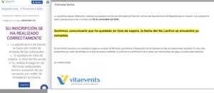 15 DE OCTUBRE DE 2025. RECIBO EL SIGUIENTE MENSAJE: «Estimada familia: Le escribimos desde VitaEvents, empresa que gestiona la Escuela Municipal de Días No Lectivos del Ayuntamiento de Majadahonda en relación a su solicitud de plaza o plazas para el día no lectivo del 3 de noviembre del 2025. Sentimos comunicarle que ha quedado en lista de espera, la fecha del No Lectivo se encuentra ya completa. Si otra familia cancela o no completa el pago en el plazo de 48 horas, pondremos a disposición de las familias en lista de espera esas vacantes. En ese caso, avisaremos por orden de entrada en la lista de espera mediante un email de la confirmación de la plaza, las instrucciones de pago y el plazo para realizarlo. Un cordial saludo».