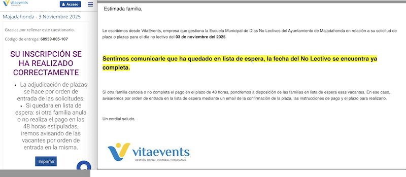 15 DE OCTUBRE DE 2025. RECIBO EL SIGUIENTE MENSAJE: «Estimada familia: Le escribimos desde VitaEvents, empresa que gestiona la Escuela Municipal de Días No Lectivos del Ayuntamiento de Majadahonda en relación a su solicitud de plaza o plazas para el día no lectivo del 3 de noviembre del 2025. Sentimos comunicarle que ha quedado en lista de espera, la fecha del No Lectivo se encuentra ya completa. Si otra familia cancela o no completa el pago en el plazo de 48 horas, pondremos a disposición de las familias en lista de espera esas vacantes. En ese caso, avisaremos por orden de entrada en la lista de espera mediante un email de la confirmación de la plaza, las instrucciones de pago y el plazo para realizarlo. Un cordial saludo».