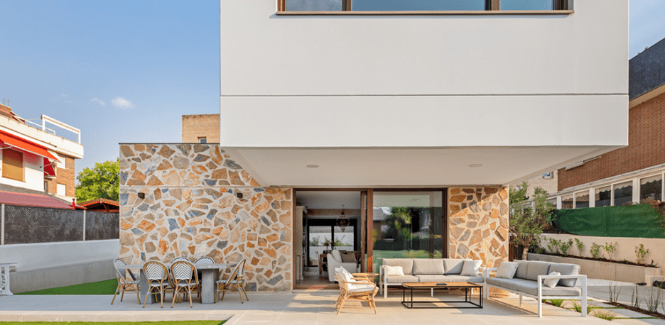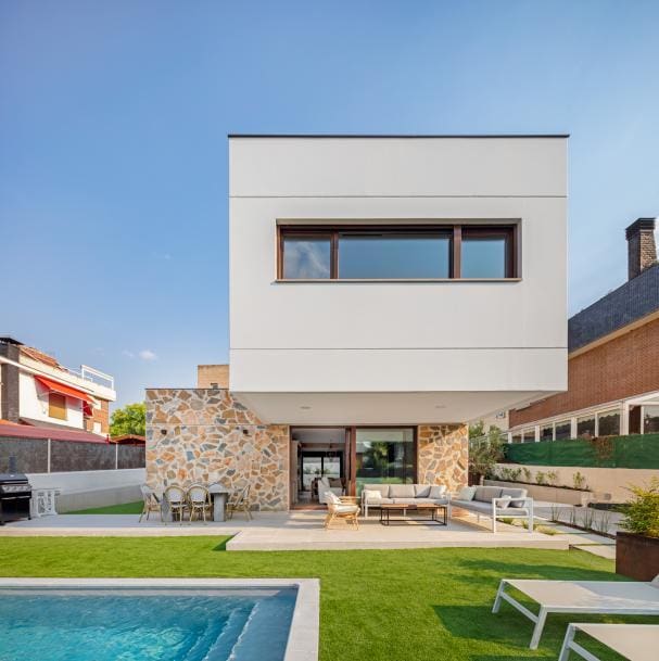 “LA PRIMERA VEZ QUE PENSÉ EN UNA CASA PREFABRICADA ME IMAGINABA LA DE LOS TRES CERDITOS”, confiesa esta nueva majariega. “En aquel momento, ella y su familia vivían en una casa pequeña que, con el tiempo, empezó a quedarse corta. Cuando la familia creció, también lo hizo la necesidad de disfrutar de más espacio. Fue una amiga cercana, que estaba construyendo su propia vivienda prefabricada, quien les descubrió esta alternativa. “Estábamos un poco reticentes porque te imaginas una casa prefabricada y piensas que va a venir un vendaval y se la va a llevar”, admite Teresa. Pero esta idea preconcebida cambió cuando pudo ver de cerca cómo avanzaba la obra de su amiga. “Estuve con ella cuando la estaban haciendo y alucinábamos”, explica. UNA VEZ CONVENCIDOS DE DAR EL PASO, LO MÁS COMPLICADO DEL PROCESO FUE ENCONTRAR LA PARCELA. “Para hacerte una casa es muy importante encontrar el terreno adecuado y no conseguíamos una parcela que nos encajara”, cuenta. A esto se le sumaba que el Ayuntamiento de Majadahonda estaba un poco reticente cuando solicitaron la licencia. “Vivimos en un pueblo de Madrid, bastante cerca de la capital” explica la propietaria en alusión a Majadahonda. Y aunque en el municipio sí existen algunas viviendas prefabricadas, en su entorno más inmediato no era lo habitual. El principal temor era que la vivienda rompiera con la estética del entorno. “Les preocupaba que fuera una casa demasiado moderna”, añade. Para evitar ese choque visual, el proyecto se adaptó al estilo de la urbanización. Inicialmente, el diseño contemplaba una fachada completamente de hormigón, pero tuvieron que introducir cambios para integrarla mejor en el entorno urbano. “Nuestra casa combina hormigón con piedra, así que no es de estas viviendas tipo cubo que se ven a veces”, explica Teresa.