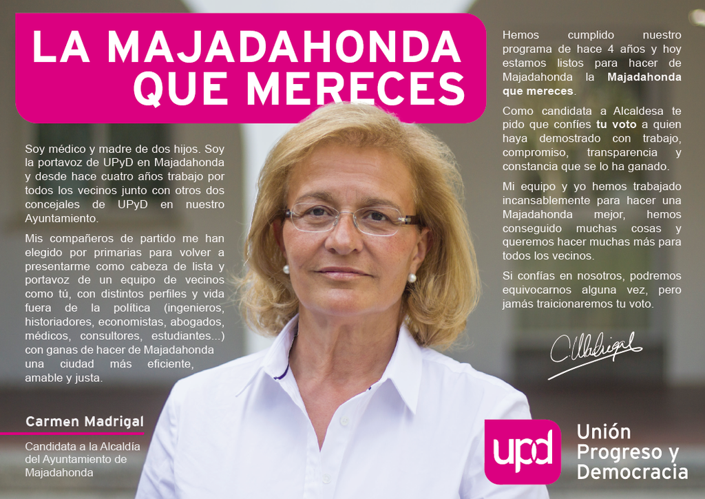 UPyD Majadahonda ha iniciado la campaña electoral sin líderes autonómicos o nacionales pero con la apertura de una sede electoral en la Gran Vía majariega, la difusión de su programa electoral y definiéndose con un título de evocaciones cinematográficas: «el extraño caso del partido que cumplió lo que prometió». Tras un desayuno con periodistas, volvieron a salir a la calle esta vez en la Plaza de Colon y difundieron en redes una de sus principales ofertas: «Queremos que los autónomos no paguen cuota a la Seguridad Social en el primer año y no paguen IVA si no cobran la factura».