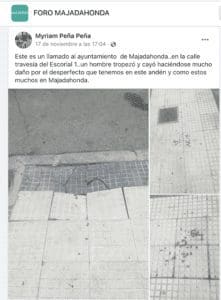 LIDIA GARCIA. Varios vecinos de Majadahonda se han dirigido por correo electrónico, wasap y redes sociales a este periódico para enviar fotos y advertir deficiencias en la gestión del Ayuntamiento. Miguel remite tres fotografías de la confluencia de la calle Puerto Rico con Colombia y de la Plaza de la Constitución con la leyenda: «Desidia municipal: más de un año y medio estropeado, abandonado y sin visos de arreglar». Otra vecina, que es además madre de un alumno de Majadahonda, envía el siguiente mensaje: «Varias mochilas inundadas con el agua de las botellas recicladas de una empresa de Murcia que regaló el Ayuntamiento: esta mañana cuando le he dicho a la profesora que tenía la agenda secándose me ha dicho que se habían producido varios casos, se mojan las mochilas y otras madres han tenido que comprar incluso otros libros de texto porque los que se habían mojado estaban inservibles y no se podían secar. Recomiendo que se tenga mucho cuidado con estas botellas si se meten en el bolso o en la mochila». La vecina Myriam Peña Peña también hace «un llamado al Ayuntamiento de Majadahonda por el deterioro de una acera: «en la calle Travesía del Escorial 1 un hombre tropezó y cayó haciéndose mucho daño por el desperfecto que tenemos en este andén y como estos muchos en Majadahonda». Estrella Redondo Fernández lamenta que «aquí la prioridad son las flores frescas. Todo fachada y no se dan cuenta que la buena imagen está en la seguridad». Y Hugo Casillas se lo toma con humor: «ojo y las banderas para que sepas siempre que estás en España jejeje,jeje».