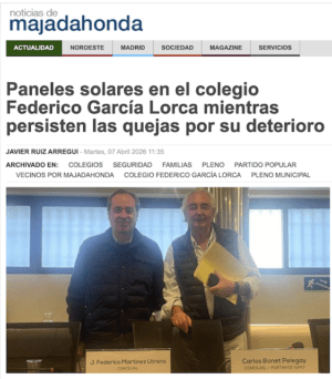 MANU RAMOS. (Majadahonda, 9 de abril de 2026). El periodista Javier Ruiz Arregui del periódico «Noticias de Majadahonda» ha señalado que «la reciente instalación de placas fotovoltaicas en el colegio público Federico García Lorca coincide con las denuncias de familias y grupos políticos por el estado de conservación del centro. Mientras se avanza en eficiencia energética, padres y Oposición reclaman una reforma integral ante problemas estructurales que afectan al día a día de alumnos y profesores».