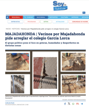 LA MOCIÓN DE «VECINOS POR MAJADAHONDA» QUE PROVOCÓ EL DEBATE: Una nota de prensa del grupo vecinal informa que presentó una moción en el último pleno del Ayuntamiento celebrado el 26 de marzo de 2026 basada en las diferentes quejas de muchas familias que llevan sus hijos al colegio Federico Garcia Lorca y han dirigido una carta al Ayuntamiento: «Mantuvimos varias conversaciones con ellos y estaban muy preocupados por el estado y deterioro del centro escolar, construido en el año 1983, pues consideran que el mantenimiento que se le ha podido hacer no ha sido el más adecuado, de ahí las quejas. Entre las diferentes deficiencias que nos comentan se mencionan goteras, humedades, así como desperfectos en diferentes áreas del centro. Añaden que todos los años con las lluvias se ven numerosas áreas afectadas como son las aulas o zonas comunes, lo que dificulta poder desempeñar la labor docente en unas mínimas condiciones para ejercer la actividad educativa y un riesgo tanto para la seguridad de los alumnos como de todo el personal del centro», según la moción que defendió el portavoz municipal y concejal vecinal, Carlos Bonet. La moción alcanzó 10 votos correspondientes a toda la Oposición (Vox, PSOE y Más Madrid-IU), que estimó justas las demandas, pero la mayoría absoluta del PP (15 votos) echó abajo la propuesta.