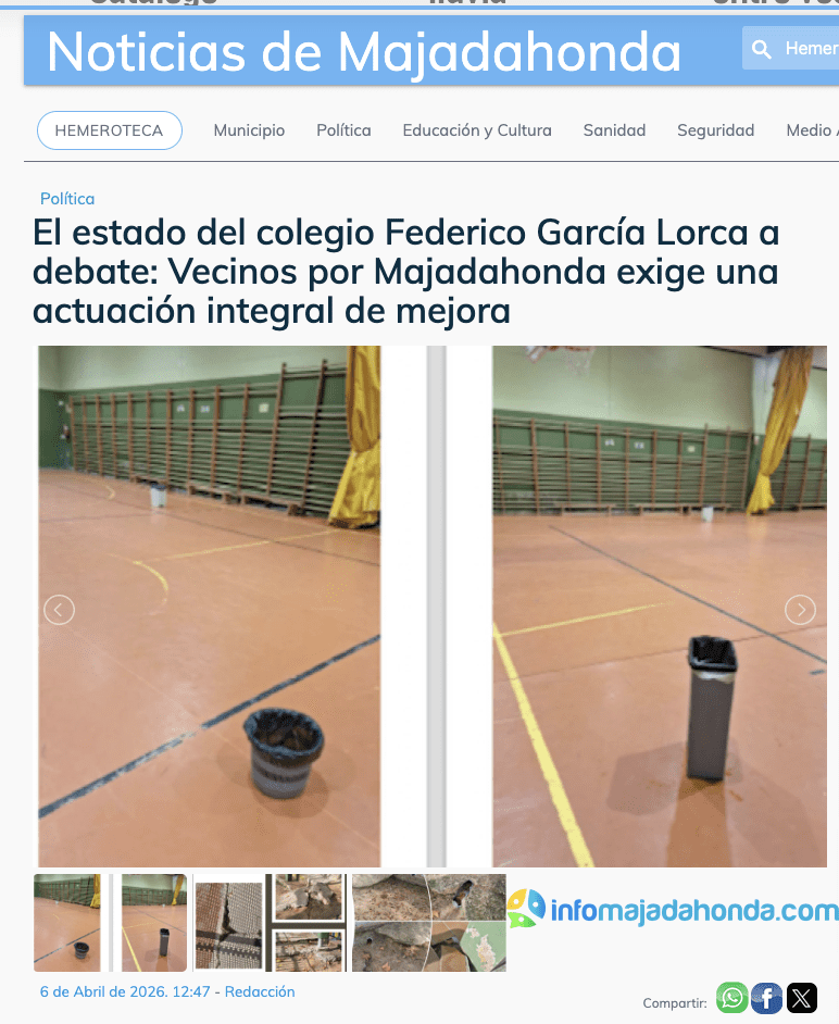 LA MOCIÓN DE «VECINOS POR MAJADAHONDA» QUE PROVOCÓ EL DEBATE: Una nota de prensa del grupo vecinal informa que presentó una moción en el último pleno del Ayuntamiento celebrado el 26 de marzo de 2026 basada en las diferentes quejas de muchas familias que llevan sus hijos al colegio Federico Garcia Lorca y han dirigido una carta al Ayuntamiento: «Mantuvimos varias conversaciones con ellos y estaban muy preocupados por el estado y deterioro del centro escolar, construido en el año 1983, pues consideran que el mantenimiento que se le ha podido hacer no ha sido el más adecuado, de ahí las quejas. Entre las diferentes deficiencias que nos comentan se mencionan goteras, humedades, así como desperfectos en diferentes áreas del centro. Añaden que todos los años con las lluvias se ven numerosas áreas afectadas como son las aulas o zonas comunes, lo que dificulta poder desempeñar la labor docente en unas mínimas condiciones para ejercer la actividad educativa y un riesgo tanto para la seguridad de los alumnos como de todo el personal del centro», según la moción que defendió el portavoz municipal y concejal vecinal, Carlos Bonet. La moción alcanzó 10 votos correspondientes a toda la Oposición (Vox, PSOE y Más Madrid-IU), que estimó justas las demandas, pero la mayoría absoluta del PP (15 votos) echó abajo la propuesta.