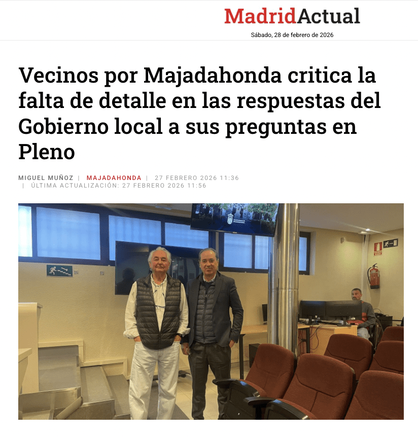 El periodista Miguel Muñoz se hace eco en la prensa regional (Madrid Actual) de las preguntas de «Vecinos por Majadahonda» y de las «escuetas» respuestas del PP.