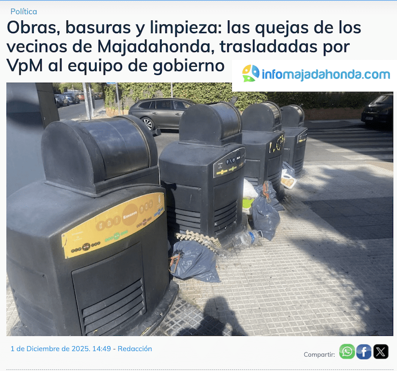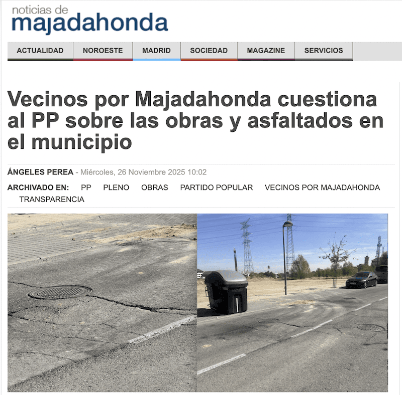 MANU RAMOS. (Majadahonda, 5 de diciembre de 2025). Los concejales de Vecinos por Majadahonda, Carlos Bonet (portavoz) y Federico Martínez (portavoz adjunto), entregaron al Equipo de Gobierno del Partido Popular (PP), que gobierna el municipio con mayoría absoluta, un total de 12 preguntas, contestadas en el último pleno del Ayuntamiento de Majadahonda, unas con respuesta oral y otras escritas. La mayoría de las preguntas llegaron al Grupo Municipal por teléfono (91 6341793) o correo electrónico (vecinospormajadahonda@majadahonda.org) por problemas, quejas e iniciativas de los propios vecinos, pero también en visitas presenciales a las oficinas del grupo municipal situadas en los soportales del Ayuntamiento, según informa el grupo vecinal en una nota de prensa. Las 12 preguntas realizadas sobre obras, aceras, asfaltados, árboles junto al cementerio, basuras, ruidos de vehículos a motor y coches abandonados fueron contestadas «con curiosas respuestas por parte del PP, textos que se han publicado igualmente en la página web vecinal. Y a partir de ahora, los dos concejales vecinales están realizando ya un seguimiento para comprobar si se cumplen esas respuestas proporcionadas por el Grupo Popular, por lo que ruegan a los vecinos afectados que consulten esta información con el objetivo de realizar estas mismas comprobaciones sobre la solución a sus problemas, que este grupo municipal ha llevado al pleno», concluye el comunicado. Las preguntas formuladas, que figuran de forma íntegra en la página web de «Vecinos por Majadahonda» en dos noticias diferentes y las respuestas que les dio el Grupo Popular son las siguientes.