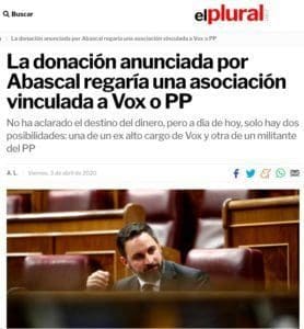 ADRIÁN LARDIEZ (El Plural): «EL DINERO SE QUEDARÁ EN CASA«. «La donación anunciada por Abascal regaría una asociación vinculada a Vox o PP. No ha aclarado el destino del dinero, pero a día de hoy, solo hay dos posibilidades: una de un ex alto cargo de Vox y otra de un militante del PP. Y es que Vox lo ha vuelto a hacer. En un ejercicio de trilerismo ha tratado de hacer creer a la opinión pública que donarán parte del dinero recibido como grupo parlamentario a la causa contra el coronavirus, pero han escondido la bolita. Los de Santiago Abascal no han aclarado a qué asociación o asociaciones van a destinar el dinero pero resulta llamativo que, a día de hoy, solo hay dos relacionadas con el Covid-19: una fundada por un ex alto cargo de Vox y la otra por un militante del PP. Santiago Abascal lo anunció así: «Los periodistas lacayos del gobierno no te contarán esto: Vox donará íntegramente la subvención de su grupo parlamentario de marzo y abril a asociaciones de víctimas del coronavirus. Espero que los demás partidos hagan lo mismo». Vox no ha especificado a qué asociación y no atienden las preguntas, algo ya habitual dado el veto contra este periódico. Vox no ha aclarado el destino del dinero, pero con las opciones que hay encima de la mesa y a expensas de que se haga oficial, las opciones son bien limitadas. En otras palabras, el dinero se quedará en casa».